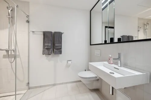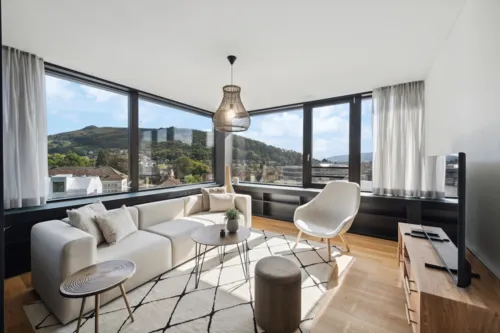 The newly built Akara Tower in 2023 is located in the charming city center of Baden, directly on the car-free Brown-Boveri Square. In the immediate vicinity, you will find numerous practical amenities such as a cinema, supermarkets (open until 9:00 PM at the train station), Starbucks, co-working spaces, various restaurants, and much more.