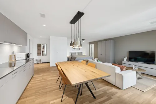 The location of the elron club Apartments at Tivoli Garden near Zurich combines urban convenience with peaceful proximity to nature. Situated directly within Switzerland's largest shopping center, Shoppi Tivoli, residents enjoy a wealth of shopping, leisure, and dining options right on their doorstep.